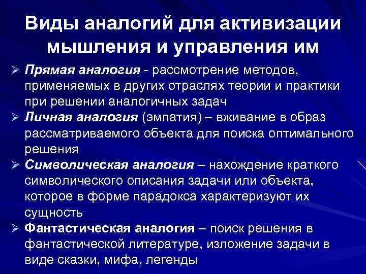 Виды аналогий для активизации мышления и управления им Ø Прямая аналогия - рассмотрение методов, применяемых в других отраслях теории и практики при решении аналогичных задач Ø Личная аналогия (эмпатия) – вживание в образ рассматриваемого объекта для поиска оптимального решения Ø Символическая аналогия – нахождение краткого символического описания задачи или объекта, которое в форме парадокса характеризуют их сущность Ø Фантастическая аналогия – поиск решения в фантастической литературе, изложение задачи в виде сказки, мифа, легенды