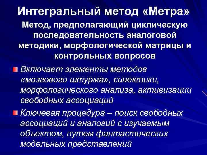 Интегральный метод «Метра» Метод, предполагающий циклическую последовательность аналоговой методики, морфологической матрицы и контрольных вопросов Включает элементы методов «мозгового штурма» , синектики, морфологического анализа, активизации свободных ассоциаций Ключевая процедура – поиск свободных ассоциаций и аналогий с изучаемым объектом, путем фантастических модельных представлений