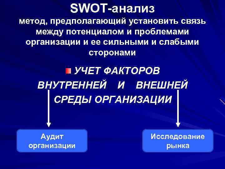 SWOT-анализ метод, предполагающий установить связь между потенциалом и проблемами организации и ее сильными и слабыми сторонами УЧЕТ ФАКТОРОВ ВНУТРЕННЕЙ И ВНЕШНЕЙ СРЕДЫ ОРГАНИЗАЦИИ Аудит Исследование организации рынка