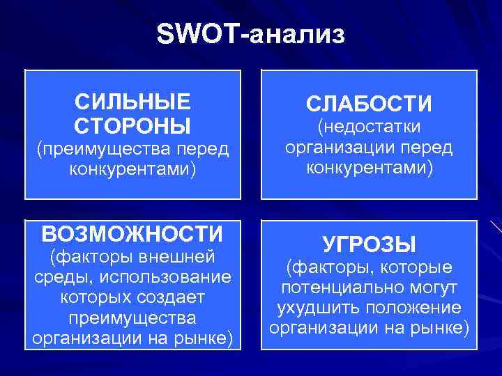 SWOT-анализ СИЛЬНЫЕ СЛАБОСТИ СТОРОНЫ (недостатки (преимущества перед организации перед конкурентами) ВОЗМОЖНОСТИ УГРОЗЫ (факторы внешней (факторы, которые среды, использование потенциально могут которых создает ухудшить положение преимущества организации на рынке)
