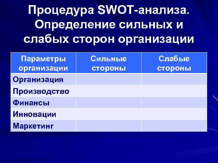Процедура SWOT-анализа. Определение сильных и слабых сторон организации Параметры Сильные Слабые организации стороны Организация Производство Финансы Инновации Маркетинг