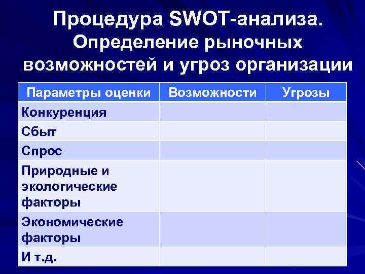 Процедура SWOT-анализа. Определение рыночных возможностей и угроз организации Параметры оценки Возможности Угрозы Конкуренция Сбыт Спрос Природные и экологические факторы Экономические факторы И т. д.