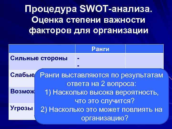 Процедура SWOT-анализа. Оценка степени важности факторов для организации Ранги Сильные стороны - Ранги выставляются по результатам Слабые стороны - ответа на 2 вопроса: Возможности Насколько высока вероятность, 1) - что это случится? Угрозы 2) Насколько это может повлиять на - организацию?