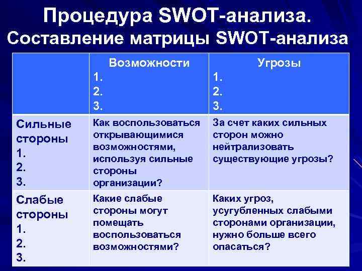 Процедура SWOT-анализа. Составление матрицы SWOT-анализа Возможности Угрозы 1. 2. 2. 3. 3. Сильные Как воспользоваться За счет каких сильных стороны открывающимися сторон можно возможностями, нейтрализовать 1. используя сильные существующие угрозы? 2. стороны 3. организации? Слабые Какие слабые Каких угроз, стороны могут усугубленных слабыми помещать сторонами организации, 1. воспользоваться нужно больше всего 2. возможностями? опасаться? 3.
