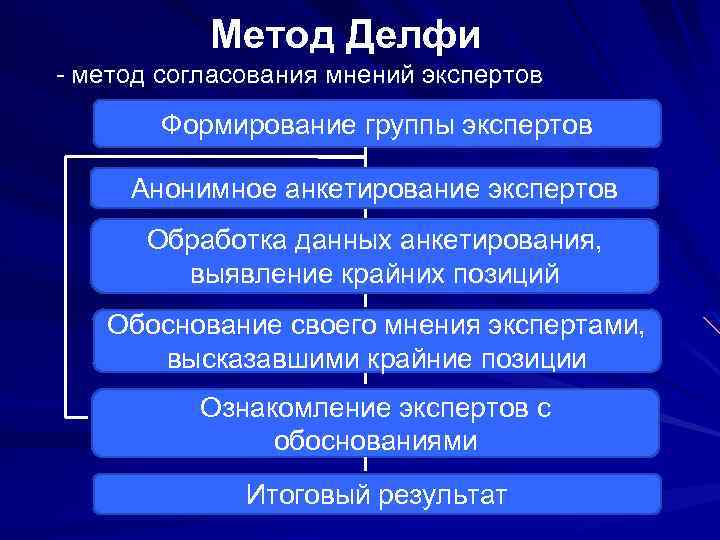 Метод Делфи - метод согласования мнений экспертов Формирование группы экспертов Анонимное анкетирование экспертов Обработка данных анкетирования, выявление крайних позиций Обоснование своего мнения экспертами, высказавшими крайние позиции Ознакомление экспертов с обоснованиями Итоговый результат