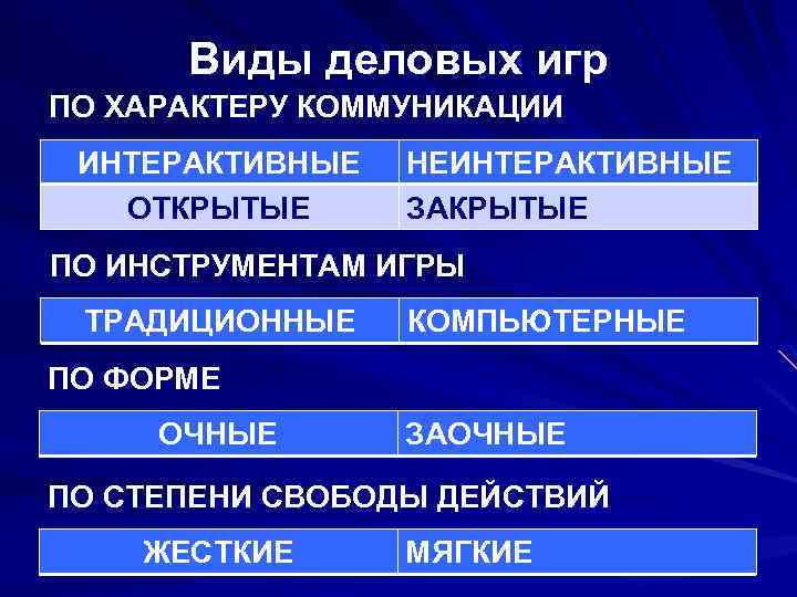 Виды деловых игр ПО ХАРАКТЕРУ КОММУНИКАЦИИ ИНТЕРАКТИВНЫЕ НЕИНТЕРАКТИВНЫЕ ОТКРЫТЫЕ ЗАКРЫТЫЕ ПО ИНСТРУМЕНТАМ ИГРЫ ТРАДИЦИОННЫЕ КОМПЬЮТЕРНЫЕ ПО ФОРМЕ ОЧНЫЕ ЗАОЧНЫЕ ПО СТЕПЕНИ СВОБОДЫ ДЕЙСТВИЙ ЖЕСТКИЕ МЯГКИЕ