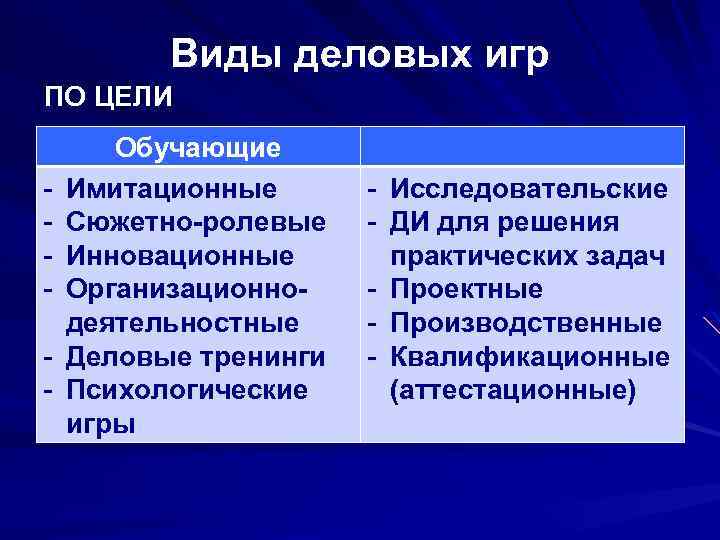 Виды деловых игр ПО ЦЕЛИ Обучающие - Имитационные - Исследовательские - Сюжетно-ролевые - ДИ для решения - Инновационные практических задач - Организационно- - Проектные деятельностные - Производственные - Деловые тренинги - Квалификационные - Психологические (аттестационные) игры