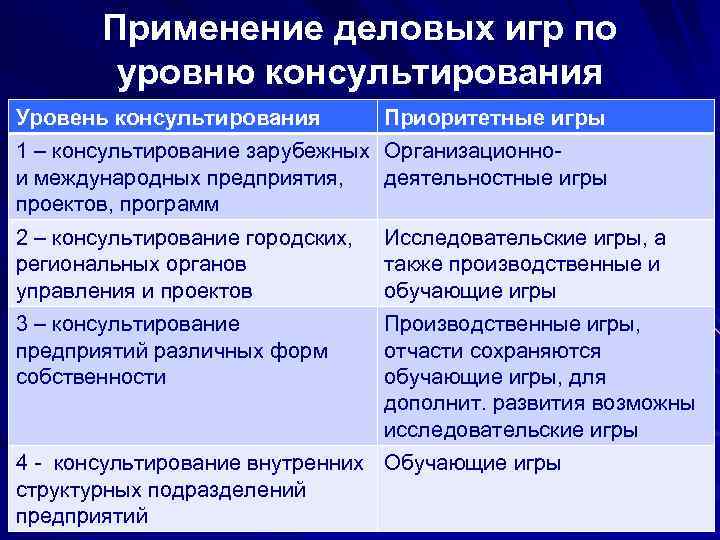 Применение деловых игр по уровню консультирования Уровень консультирования Приоритетные игры 1 – консультирование зарубежных Организационно- и международных предприятия, деятельностные игры проектов, программ 2 – консультирование городских, Исследовательские игры, а региональных органов также производственные и управления и проектов обучающие игры 3 – консультирование Производственные игры, предприятий различных форм отчасти сохраняются собственности обучающие игры, для дополнит. развития возможны исследовательские игры 4 - консультирование внутренних Обучающие игры структурных подразделений предприятий