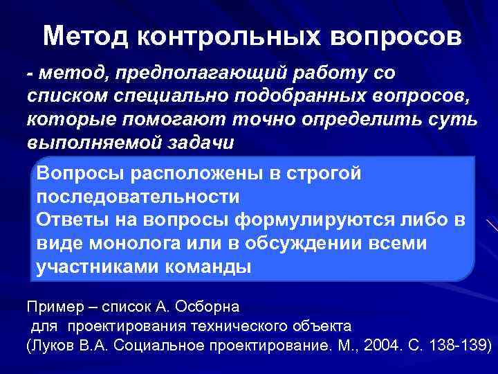 Метод контрольных вопросов - метод, предполагающий работу со списком специально подобранных вопросов, которые помогают точно определить суть выполняемой задачи Вопросы расположены в строгой последовательности Ответы на вопросы формулируются либо в виде монолога или в обсуждении всеми участниками команды Пример – список А. Осборна для проектирования технического объекта (Луков В. А. Социальное проектирование. М. , 2004. С. 138 -139)