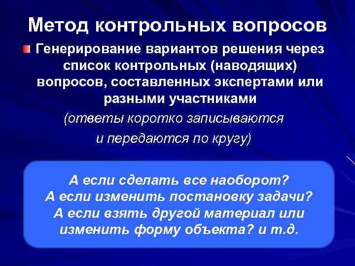 Метод контрольных вопросов Генерирование вариантов решения через список контрольных (наводящих) вопросов, составленных экспертами или разными участниками (ответы коротко записываются и передаются по кругу) А если сделать все наоборот? А если изменить постановку задачи? А если взять другой материал или изменить форму объекта? и т. д.