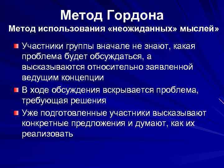 Метод Гордона Метод использования «неожиданных» мыслей» Участники группы вначале не знают, какая проблема будет обсуждаться, а высказываются относительно заявленной ведущим концепции В ходе обсуждения вскрывается проблема, требующая решения Уже подготовленные участники высказывают конкретные предложения и думают, как их реализовать