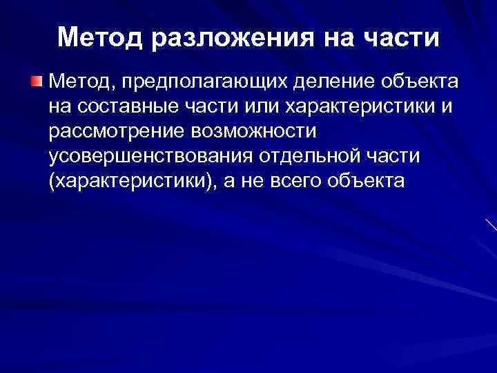Метод разложения на части Метод, предполагающих деление объекта на составные части или характеристики и рассмотрение возможности усовершенствования отдельной части (характеристики), а не всего объекта