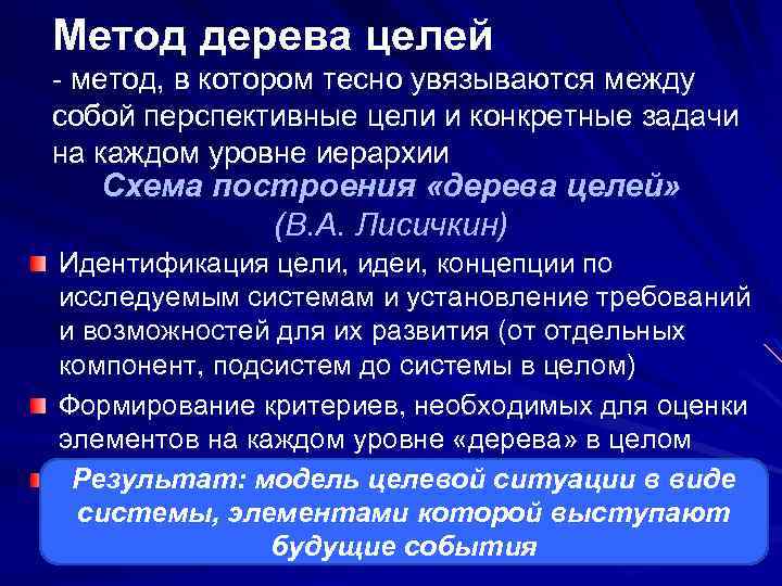 Метод дерева целей - метод, в котором тесно увязываются между собой перспективные цели и конкретные задачи на каждом уровне иерархии Схема построения «дерева целей» (В. А. Лисичкин) Идентификация цели, идеи, концепции по исследуемым системам и установление требований и возможностей для их развития (от отдельных компонент, подсистем до системы в целом) Формирование критериев, необходимых для оценки элементов на каждом уровне «дерева» в целом Результат: модель целевой ситуации в виде Определение весовых коэффициентов каждого элемента «дерева целей» на каждомвыступают системы, элементами которой его уровне будущие события