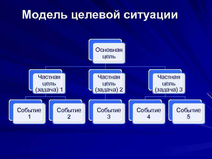 Модель целевой ситуации Основная цель Частная цель (задача) 1 (задача) 2 (задача) 3 Событие Событие 1 2 3 4 5