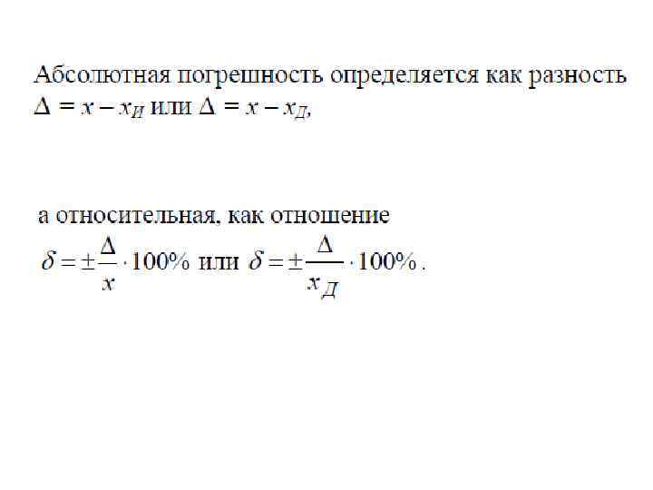 Погрешность измерения Δхизм – это отклонение результата измерения х от истинного (действительного) х. И (х. Д) значения измеряемой величины: Δхизм = х – х. Д Под истинным значением физической величины понимается значение, которое идеальным образом отражало бы в качественном и количественном отношениях соответствующие свойства технических систем (ТС) через ее выходной параметр. В зависимости от формы выражения различают абсолютную, относительную и приведенную погрешности измерения.