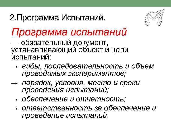 2. Программа Испытаний. Программа испытаний — обязательный документ, устанавливающий объект и цели испытаний: → виды, последовательность и объем проводимых экспериментов; → порядок, условия, место и сроки проведения испытаний; → обеспечение и отчетность; → ответственность за обеспечение и проведение испытаний.