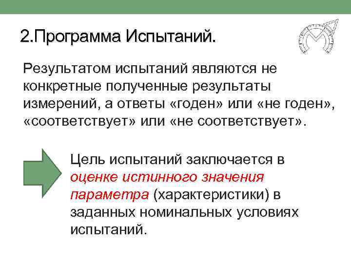 2. Программа Испытаний. Результатом испытаний являются не конкретные полученные результаты измерений, а ответы «годен» или «не годен» , «соответствует» или «не соответствует» . Цель испытаний заключается в оценке истинного значения параметра (характеристики) в заданных номинальных условиях испытаний.