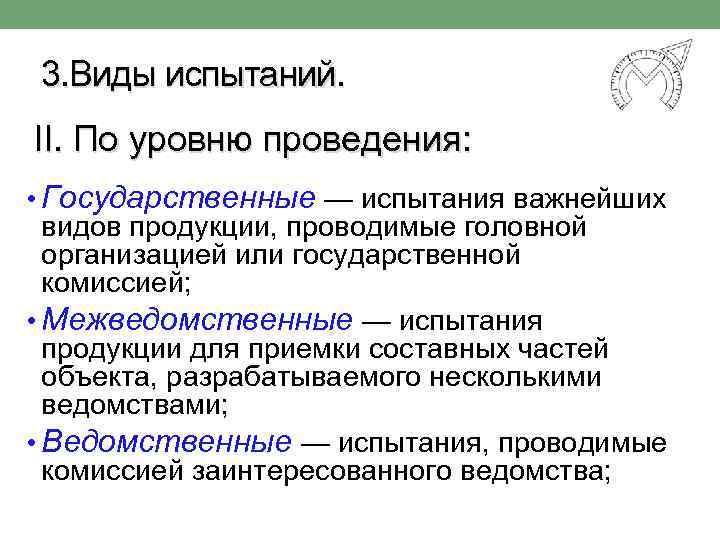 3. Виды испытаний. II. По уровню проведения: • Государственные — испытания важнейших видов продукции, проводимые головной организацией или государственной комиссией; • Межведомственные — испытания продукции для приемки составных частей объекта, разрабатываемого несколькими ведомствами; • Ведомственные — испытания, проводимые комиссией заинтересованного ведомства;