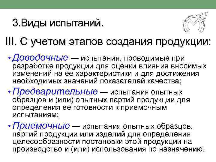 3. Виды испытаний. III. С учетом этапов создания продукции: • Доводочные — испытания, проводимые при разработке продукции для оценки влияния вносимых изменений на ее характеристики и для достижения необходимых значений показателей качества; • Предварительные — испытания опытных образцов и (или) опытных партий продукции для определения ее готовности к приемочным испытаниям; • Приемочные — испытания опытных образцов, партий продукции или изделий для определения целесообразности постановки этой продукции на производство и (или) использования по назначению.