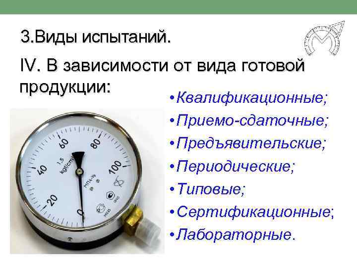 3. Виды испытаний. IV. В зависимости от вида готовой продукции: • Квалификационные; • Приемо-сдаточные; • Предъявительские; • Периодические; • Типовые; • Сертификационные; • Лабораторные.