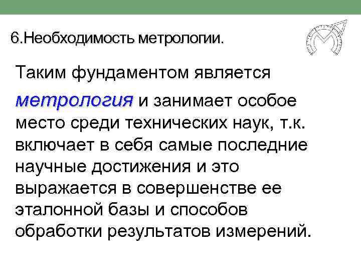 6. Необходимость метрологии. Таким фундаментом является метрология и занимает особое место среди технических наук, т. к. включает в себя самые последние научные достижения и это выражается в совершенстве ее эталонной базы и способов обработки результатов измерений.