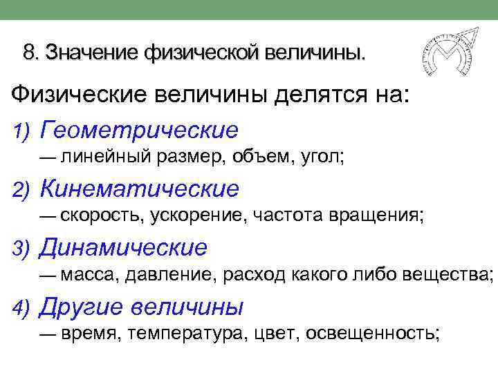 8. Значение физической величины. Физические величины делятся на: 1) Геометрические — линейный размер, объем, угол; 2) Кинематические — скорость, ускорение, частота вращения; 3) Динамические — масса, давление, расход какого либо вещества; 4) Другие величины — время, температура, цвет, освещенность;