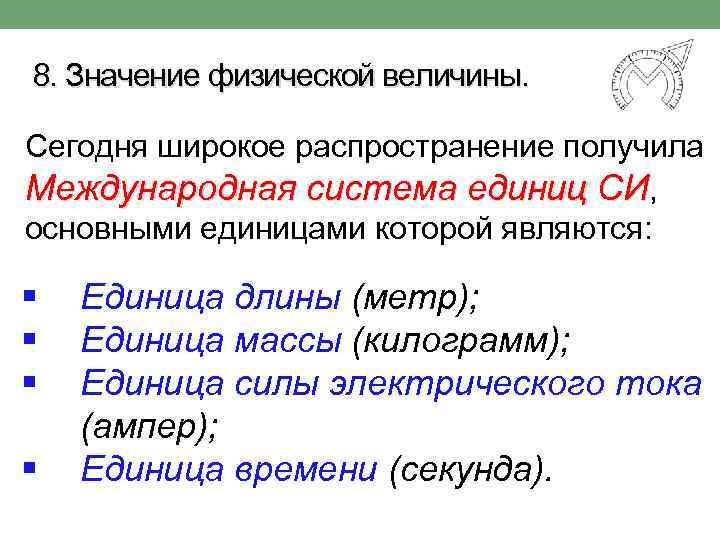 8. Значение физической величины. Сегодня широкое распространение получила Международная система единиц СИ, основными единицами которой являются: § § Единица длины (метр); Единица массы (килограмм); Единица силы электрического тока (ампер); Единица времени (секунда).