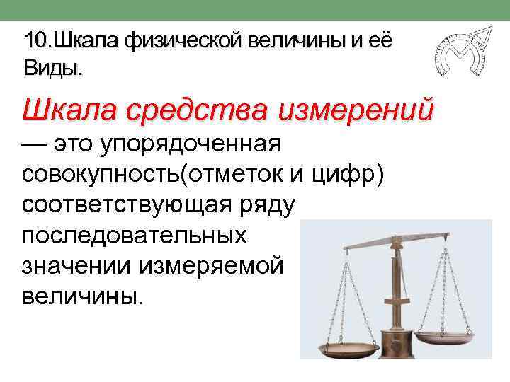 10. Шкала физической величины и её Виды. 4) Шкала отношений имеет естественное нулевое значение, а единица измерений устанавливается по согласованию. Например, шкала весов, начинаясь с нулевой отметки, может быть градуирована по разному в зависимости от требуемой точности взвешивания. 5) Абсолютные шкалы всегда имеют определение единицы измерения физической величины.