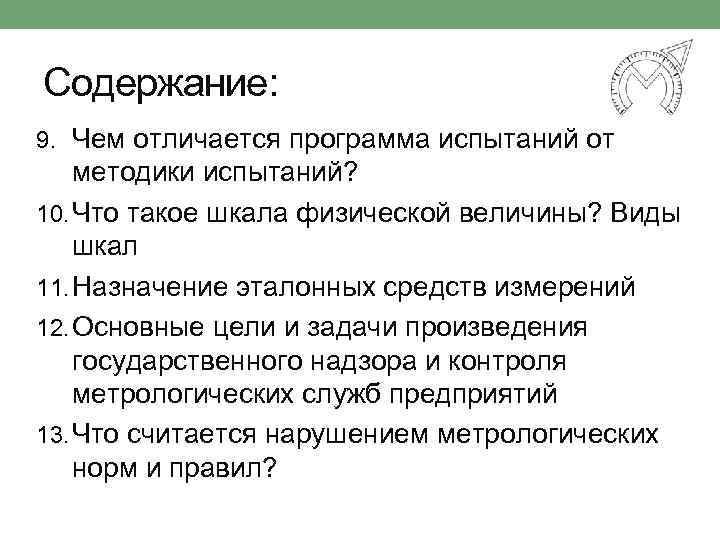 Содержание: 9. Чем отличается программа испытаний от методики испытаний? 10. Что такое шкала физической величины? Виды шкал 11. Назначение эталонных средств измерений 12. Основные цели и задачи произведения государственного надзора и контроля метрологических служб предприятий 13. Что считается нарушением метрологических норм и правил?