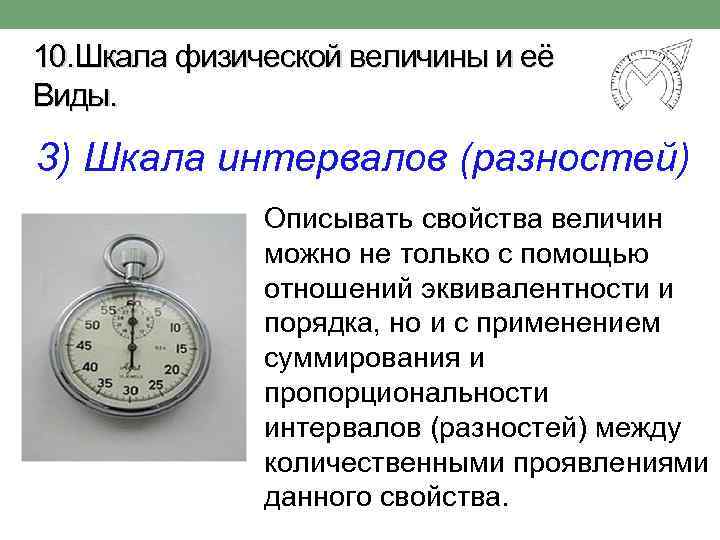 10. Шкала физической величины и её Виды. 3) Шкала интервалов (разностей) Описывать свойства величин можно не только с помощью отношений эквивалентности и порядка, но и с применением суммирования и пропорциональности интервалов (разностей) между количественными проявлениями данного свойства.
