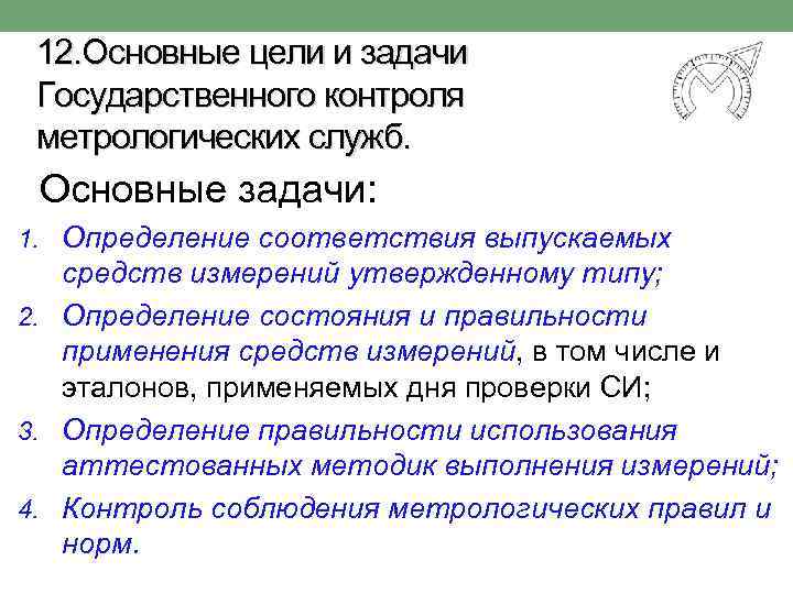 12. Основные цели и задачи Государственного контроля метрологических служб. Основные задачи: 1. Определение соответствия выпускаемых средств измерений утвержденному типу; 2. Определение состояния и правильности применения средств измерений, в том числе и эталонов, применяемых дня проверки СИ; 3. Определение правильности использования аттестованных методик выполнения измерений; 4. Контроль соблюдения метрологических правил и норм.