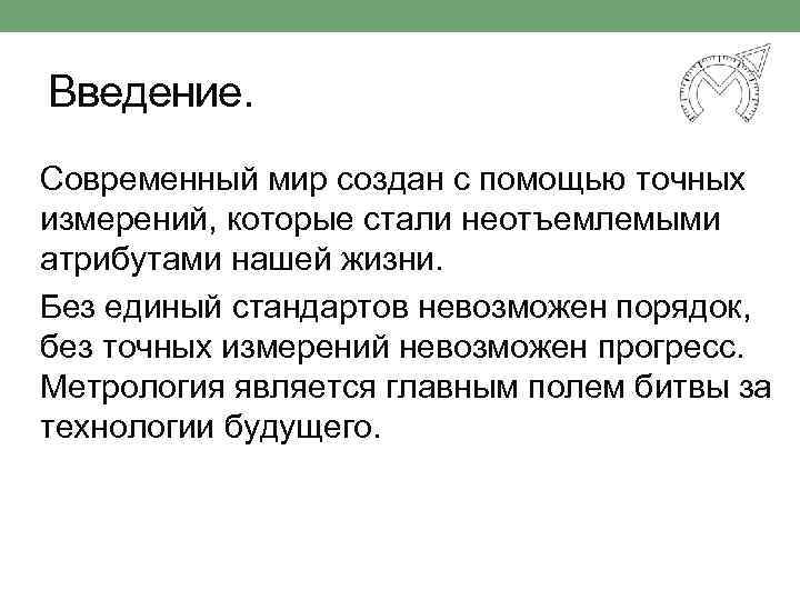 Введение. Современный мир создан с помощью точных измерений, которые стали неотъемлемыми атрибутами нашей жизни. Без единый стандартов невозможен порядок, без точных измерений невозможен прогресс. Метрология является главным полем битвы за технологии будущего.