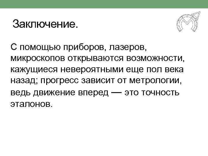 Заключение. С помощью приборов, лазеров, микроскопов открываются возможности, кажущиеся невероятными еще пол века назад; прогресс зависит от метрологии, ведь движение вперед — это точность эталонов.