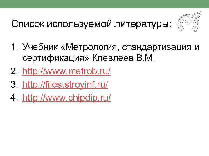 Список используемой литературы: 1. Учебник «Метрология, стандартизация и сертификация» Клевлеев В. М. 2. http: //www. metrob. ru/ 3. http: //files. stroyinf. ru/ 4. http: //www. chipdip. ru/