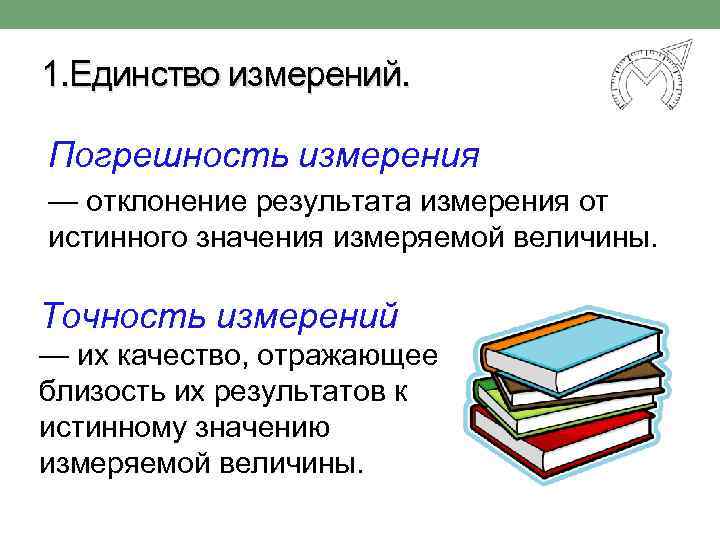 1. Единство измерений. Погрешность измерения — отклонение результата измерения от истинного значения измеряемой величины. Точность измерений — их качество, отражающее близость их результатов к истинному значению измеряемой величины.