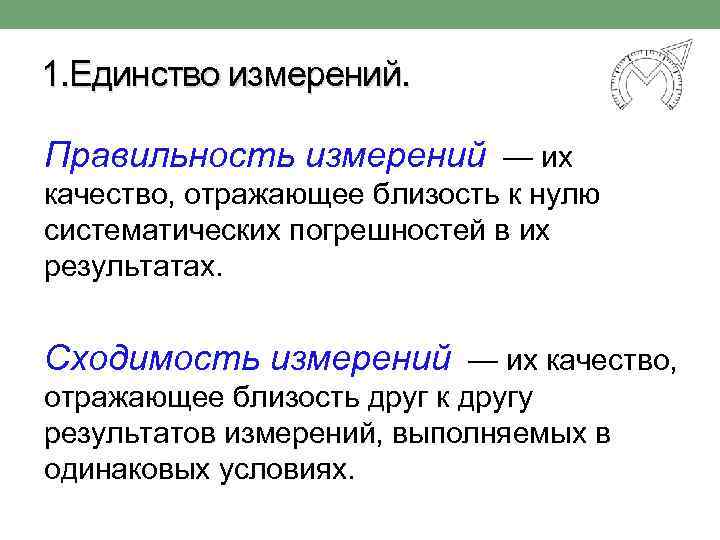 1. Единство измерений. Правильность измерений — их качество, отражающее близость к нулю систематических погрешностей в их результатах. Сходимость измерений — их качество, отражающее близость друг к другу результатов измерений, выполняемых в одинаковых условиях.