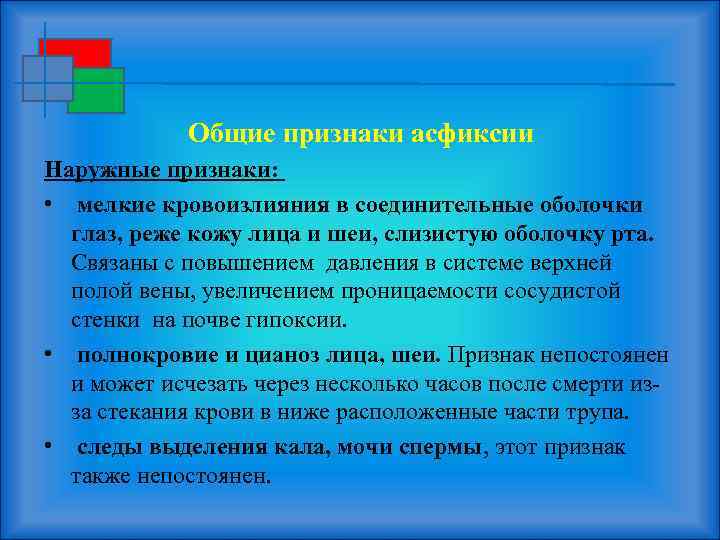 Общие признаки асфиксии Наружные признаки: • мелкие кровоизлияния в соединительные оболочки глаз, реже кожу лица и шеи, слизистую оболочку рта. Связаны с повышением давления в системе верхней полой вены, увеличением проницаемости сосудистой стенки на почве гипоксии. • полнокровие и цианоз лица, шеи. Признак непостоянен и может исчезать через несколько часов после смерти изза стекания крови в ниже расположенные части трупа. • следы выделения кала, мочи спермы, этот признак также непостоянен.