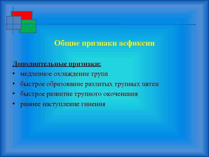 Общие признаки асфиксии Дополнительные признаки: • медленное охлаждение трупа • быстрое образование разлитых трупных пятен • быстрое развитие трупного окоченения • раннее наступление гниения