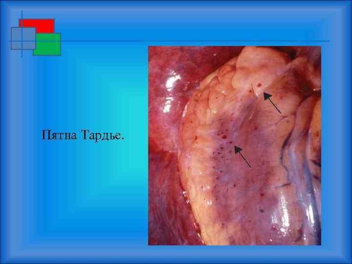 Общие признаки асфиксии Признаки, выявляемые при внутреннем исследовании: • жидкое состояние крови (обусловлено гиперкапнией) – постоянный признак • расширение и переполнение кровью правой половины сердца и полых вен • венозное полнокровие внутренних органов • мелкие кровоизлияния в серозные оболочки (чаще в плевру и эпикард) – пятна Тардье, связаны с увеличением проницаемости сосудистой стенки вследствии гипоксии, падением давления в плевральных полостях во время инспираторной одышки • острая альвеолярная, реже межуточная, эмфизема легких, возникает во время одышки.