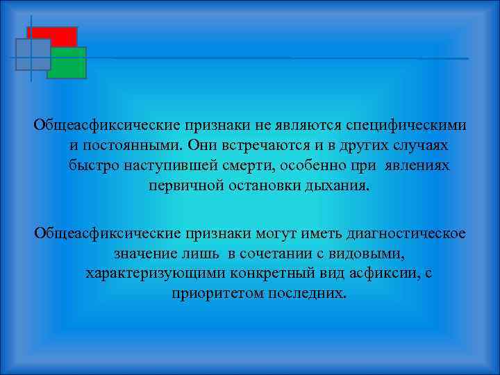 Общеасфиксические признаки не являются специфическими и постоянными. Они встречаются и в других случаях быстро наступившей смерти, особенно при явлениях первичной остановки дыхания. Общеасфиксические признаки могут иметь диагностическое значение лишь в сочетании с видовыми, характеризующими конкретный вид асфиксии, с приоритетом последних.