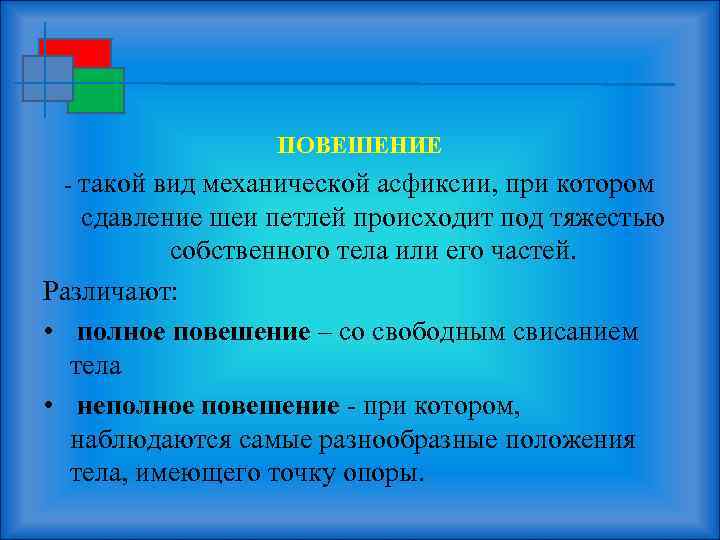 ПОВЕШЕНИЕ - такой вид механической асфиксии, при котором сдавление шеи петлей происходит под тяжестью собственного тела или его частей. Различают: • полное повешение – со свободным свисанием тела • неполное повешение - при котором, наблюдаются самые разнообразные положения тела, имеющего точку опоры.
