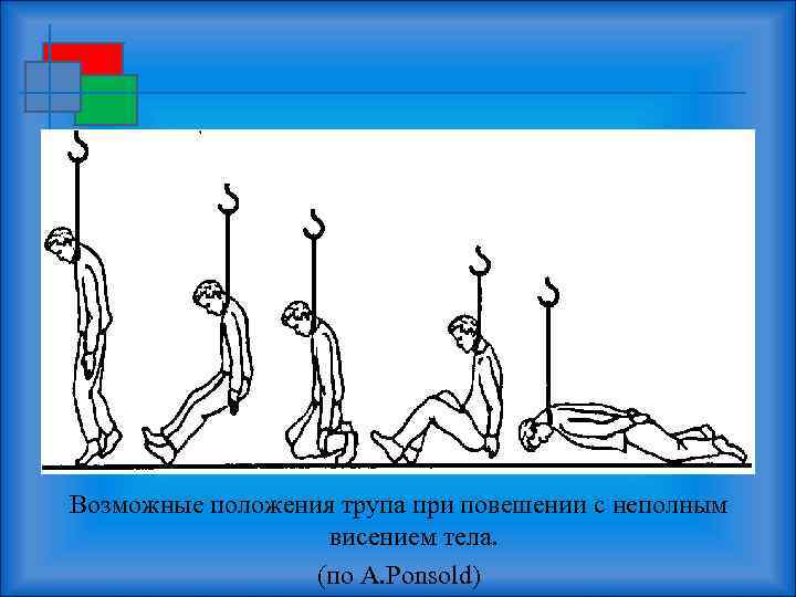 Возможные положения трупа при повешении с неполным висением тела. (по A. Ponsold)