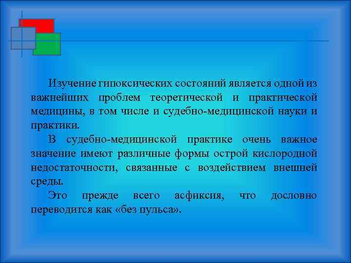 Изучение гипоксических состояний является одной из важнейших проблем теоретической и практической медицины, в том числе и судебно-медицинской науки и практики. В судебно-медицинской практике очень важное значение имеют различные формы острой кислородной недостаточности, связанные с воздействием внешней среды. Это прежде всего асфиксия, что дословно переводится как «без пульса» .