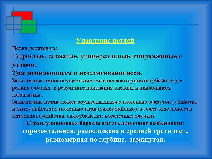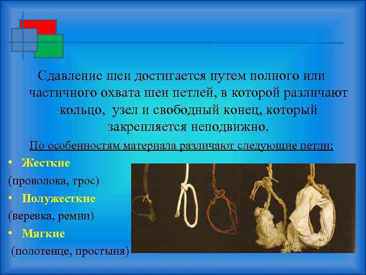 Сдавление шеи достигается путем полного или частичного охвата шеи петлей, в которой различают кольцо, узел и свободный конец, который закрепляется неподвижно. По особенностям материала различают следующие петли: • Жесткие (проволока, трос) • Полужесткие (веревка, ремни) • Мягкие (полотенце, простыня)