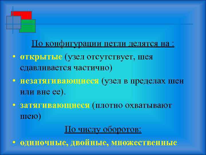 • • По конфигурации петли делятся на : открытые (узел отсутствует, шея сдавливается частично) незатягивающиеся (узел в пределах шеи или вне ее). затягивающиеся (плотно охватывают шею) По числу оборотов: одиночные, двойные, множественные