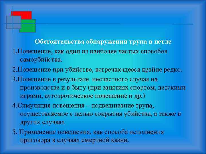 Обстоятельства обнаружения трупа в петле 1. Повешение, как один из наиболее частых способов самоубийства. 2. Повешение при убийстве, встречающееся крайне редко. 3. Повешение в результате несчастного случая на производстве и в быту (при занятиях спортом, детскими играми, аутоэротическое повешение и др. ) 4. Симуляция повешения – подвешивание трупа, осуществляемое с целью сокрытия убийства, а также в других случаях 5. Применение повешения, как способа исполнения приговора в случаях смертной казни.