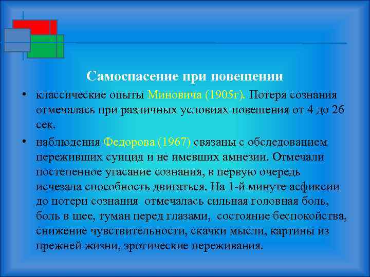 Самоспасение при повешении • классические опыты Миновича (1905 г). Потеря сознания отмечалась при различных условиях повешения от 4 до 26 сек. • наблюдения Федорова (1967) связаны с обследованием переживших суицид и не имевших амнезии. Отмечали постепенное угасание сознания, в первую очередь исчезала способность двигаться. На 1 -й минуте асфиксии до потери сознания отмечалась сильная головная боль, боль в шее, туман перед глазами, состояние беспокойства, снижение чувствительности, скачки мысли, картины из прежней жизни, эротические переживания.