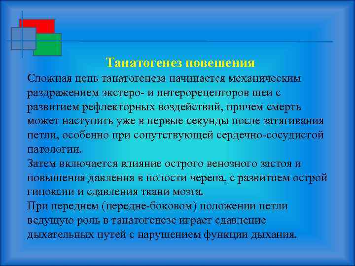 Танатогенез повешения Сложная цепь танатогенеза начинается механическим раздражением экстеро- и интерорецепторов шеи с развитием рефлекторных воздействий, причем смерть может наступить уже в первые секунды после затягивания петли, особенно при сопутствующей сердечно-сосудистой патологии. Затем включается влияние острого венозного застоя и повышения давления в полости черепа, с развитием острой гипоксии и сдавления ткани мозга. При переднем (передне-боковом) положении петли ведущую роль в танатогенезе играет сдавление дыхательных путей с нарушением функции дыхания.