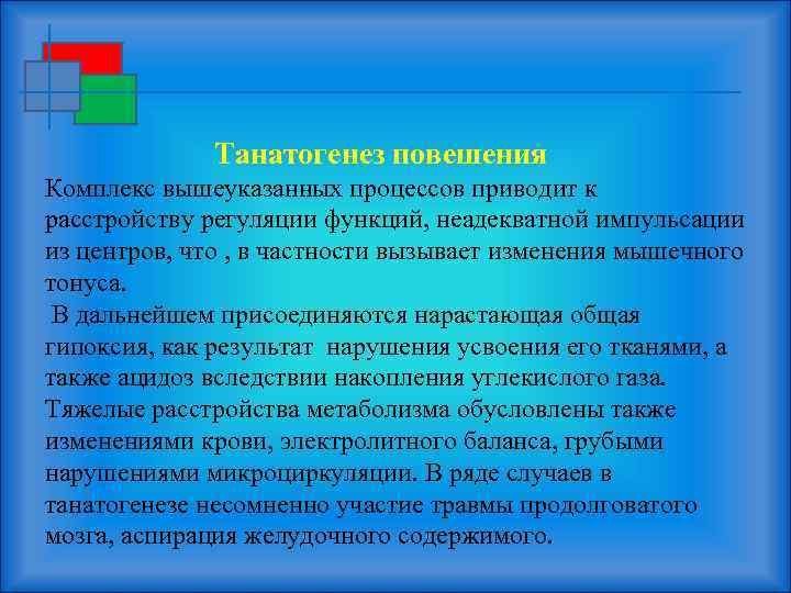 Танатогенез повешения Комплекс вышеуказанных процессов приводит к расстройству регуляции функций, неадекватной импульсации из центров, что , в частности вызывает изменения мышечного тонуса. В дальнейшем присоединяются нарастающая общая гипоксия, как результат нарушения усвоения его тканями, а также ацидоз вследствии накопления углекислого газа. Тяжелые расстройства метаболизма обусловлены также изменениями крови, электролитного баланса, грубыми нарушениями микроциркуляции. В ряде случаев в танатогенезе несомненно участие травмы продолговатого мозга, аспирация желудочного содержимого.