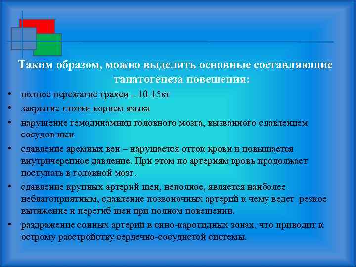 Таким образом, можно выделить основные составляющие танатогенеза повешения: • полное пережатие трахеи – 10 -15 кг • закрытие глотки корнем языка • нарушение гемодинамики головного мозга, вызванного сдавлением сосудов шеи • сдавление яремных вен – нарушается отток крови и повышается внутричерепное давление. При этом по артериям кровь продолжает поступать в головной мозг. • сдавление крупных артерий шеи, неполное, является наиболее неблагоприятным, сдавление позвоночных артерий к чему ведет резкое вытяжение и перегиб шеи при полном повешении. • раздражение сонных артерий в сино-каротидных зонах, что приводит к острому расстройству сердечно-сосудистой системы.